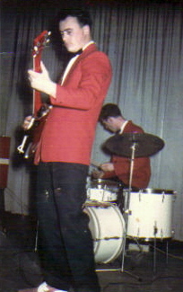 Barry Hunt wearing the Drifting Strangers stage outfit: Red jacket, black trousers, and white shoes. | ||